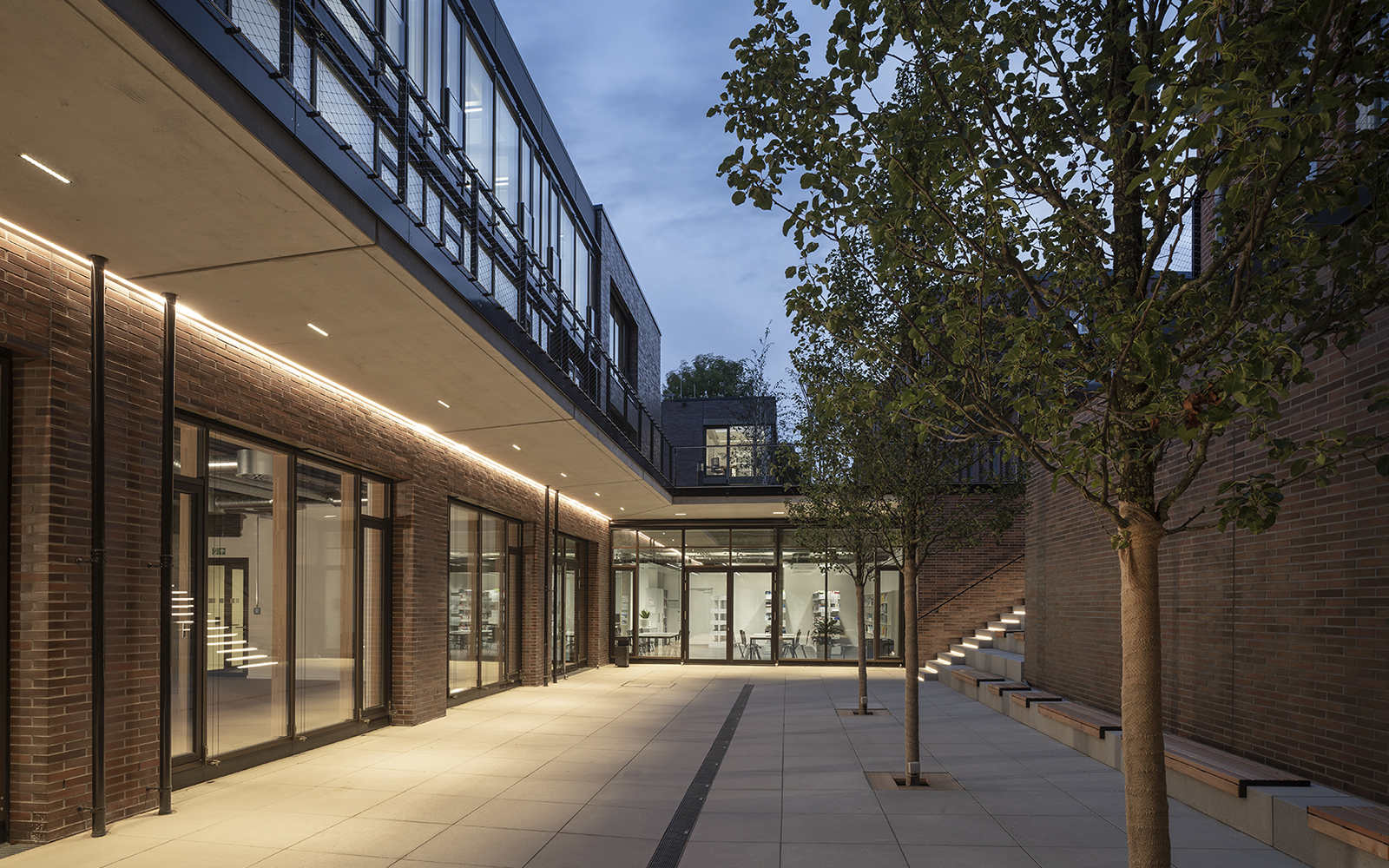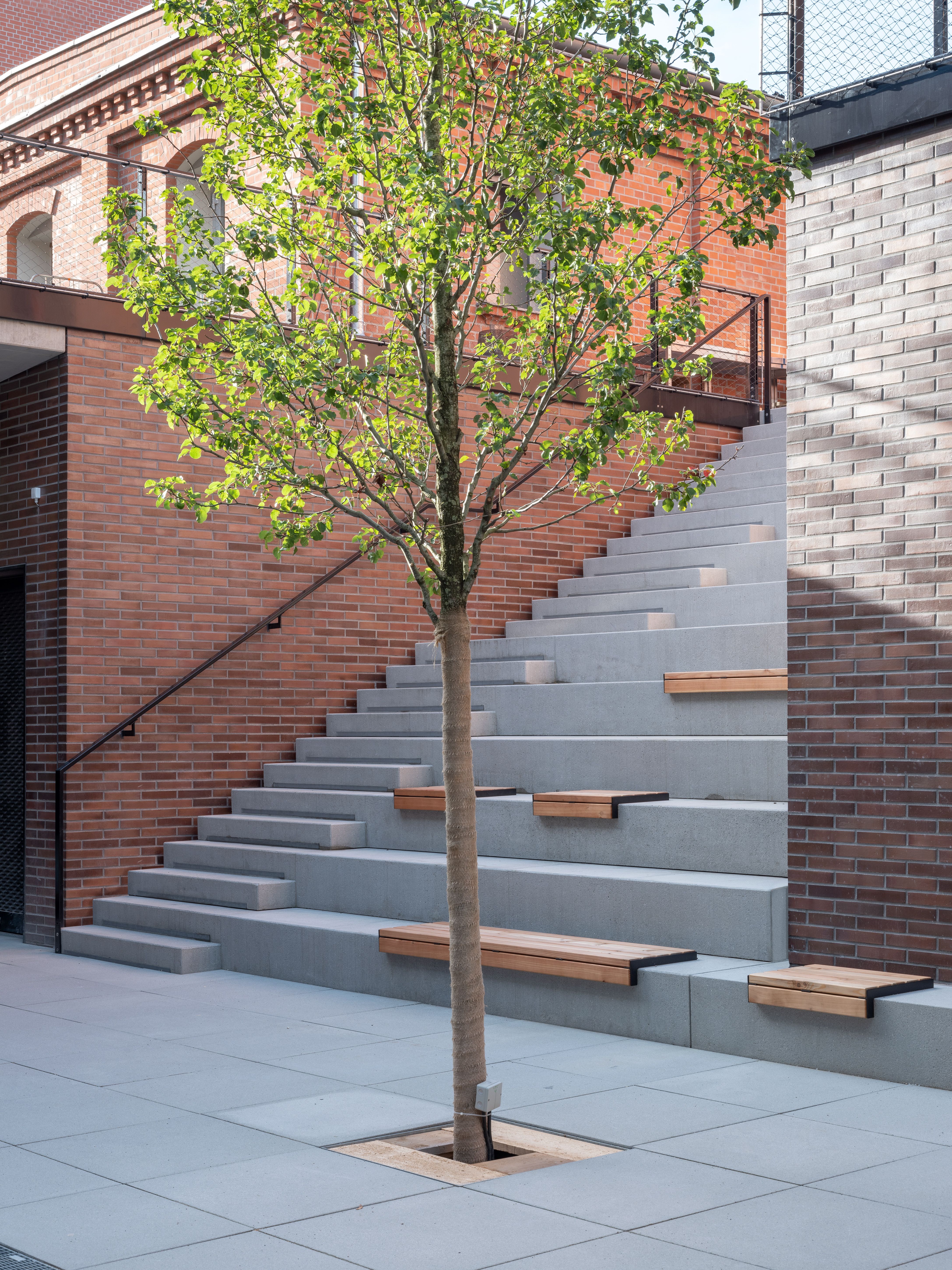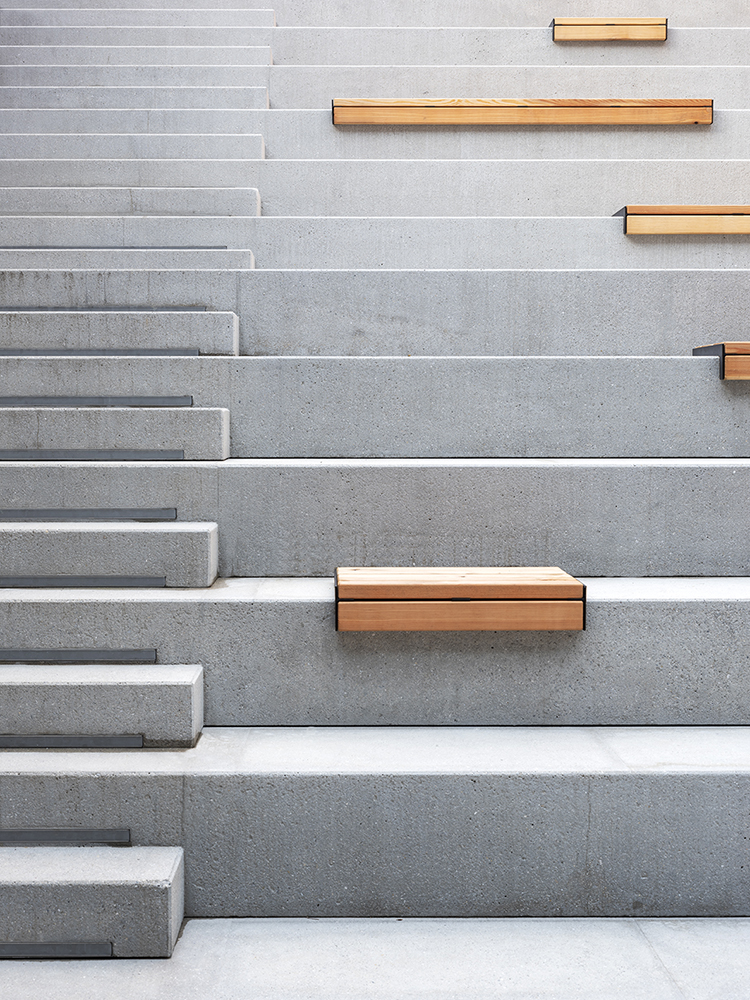 Der Tiefhof ist über eine großzügige Treppenanlage mit integrierten Sitzflächen direkt von außen zugänglich und dient als idealer Treffpunkt für die Nutzer des Campus.