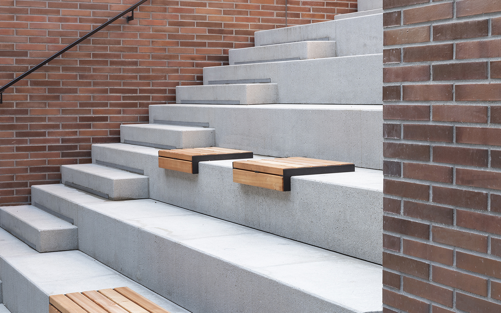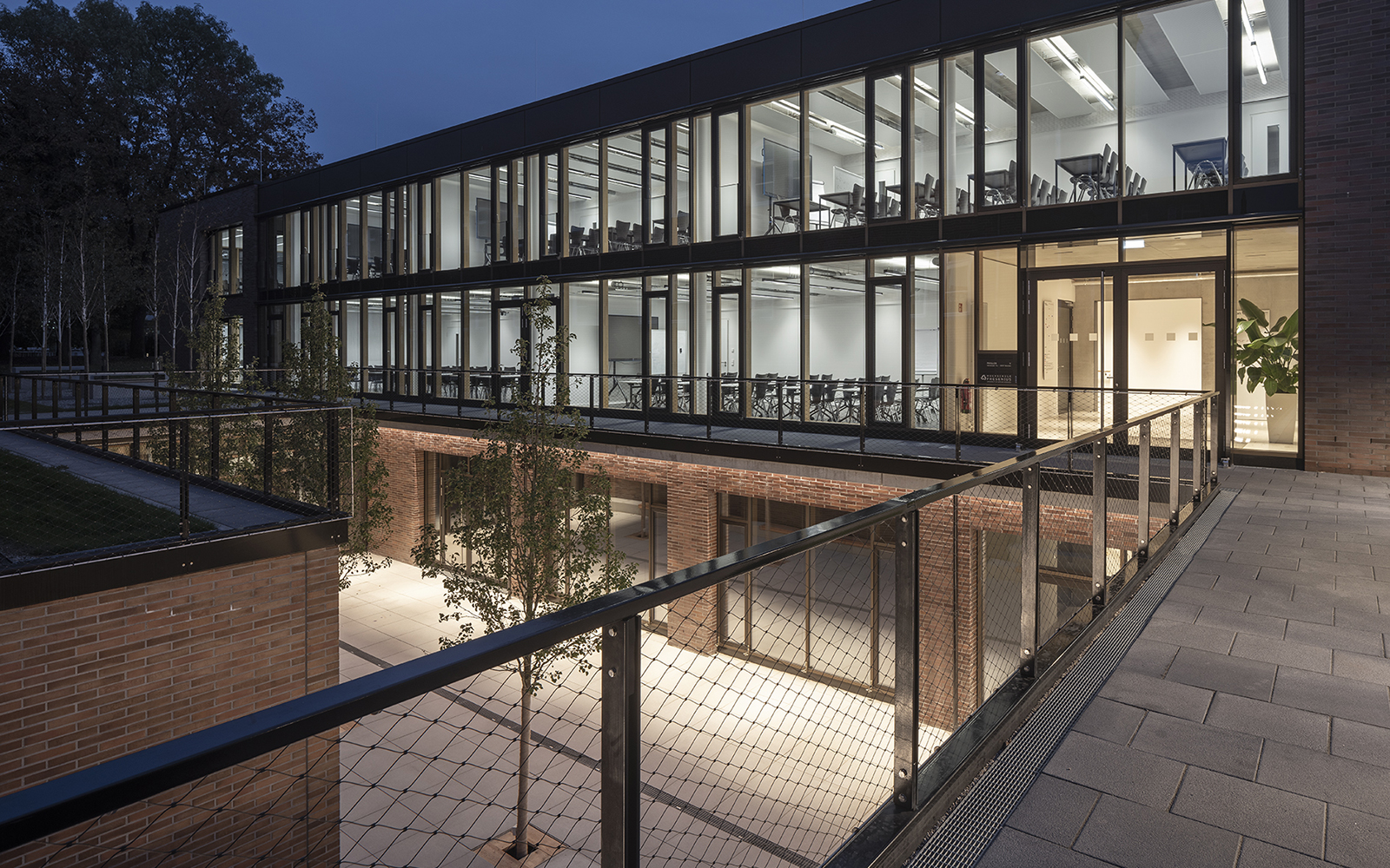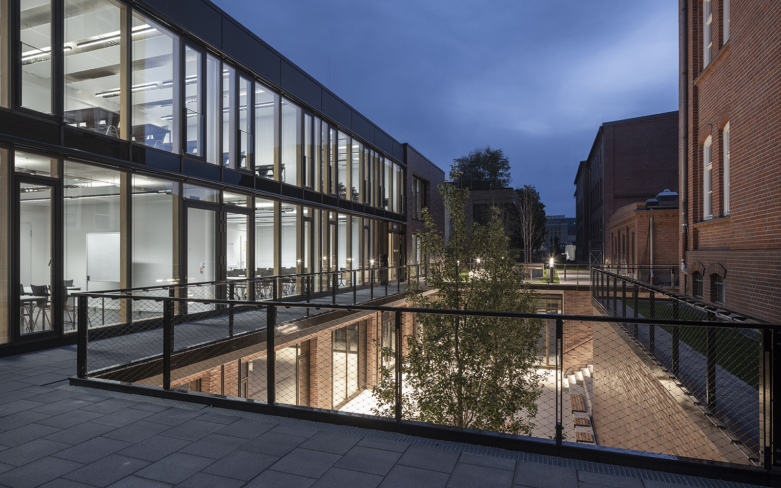 Der Tiefhof ist über eine großzügige Treppenanlage mit integrierten Sitzflächen direkt von außen zugänglich und dient als idealer Treffpunkt für die Nutzer des Campus.