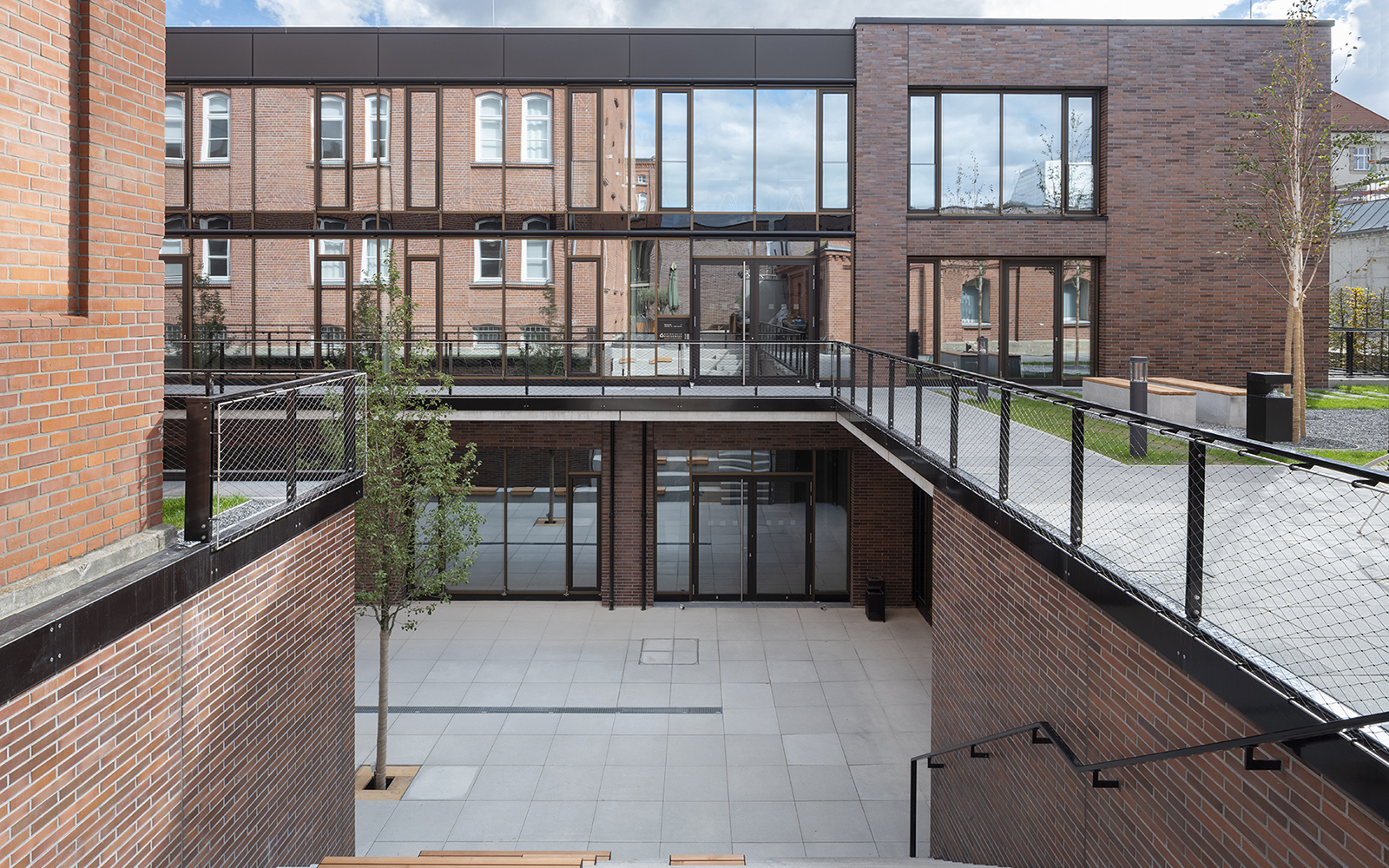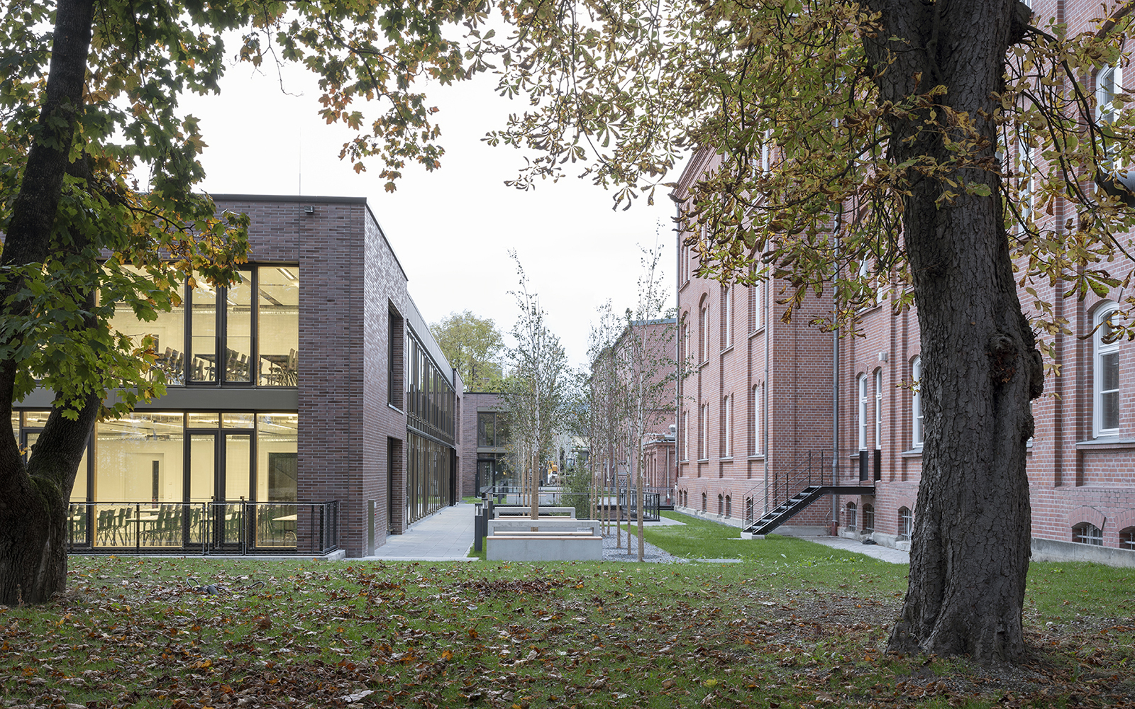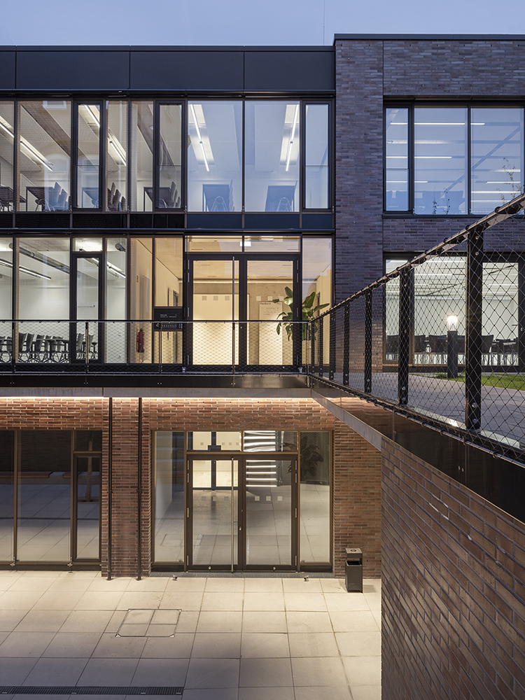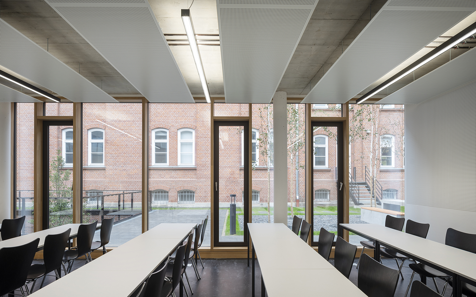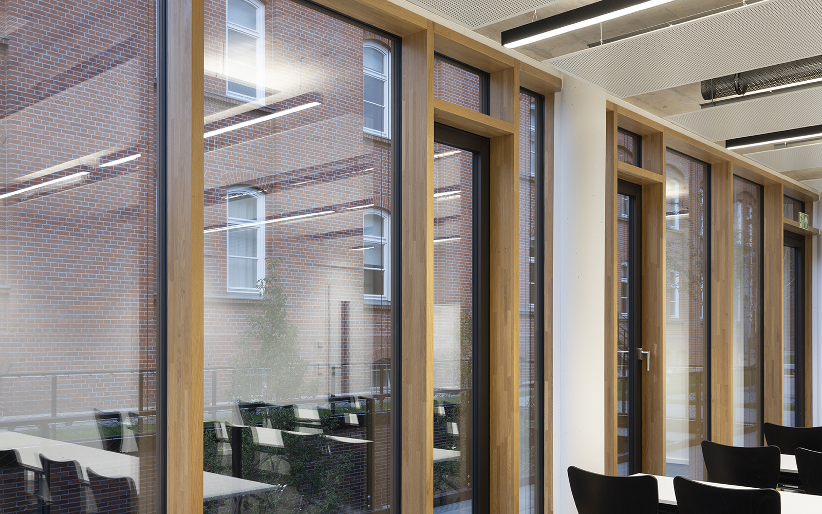 Die Gestaltung der Fassaden mit Klinkerstein und großzügigen Glasflächen der Holz-Pfosten-Riegel-Fassade, in denen sich die alten Gebäude spiegeln, wird im Innenbereich ergänzt mit einer reduzierten Auswahl an Materialien und Farben: Sichtbeton, schwarzer Stahl, heller Naturstein, dunkles Linoleum oder Industrieparkett.