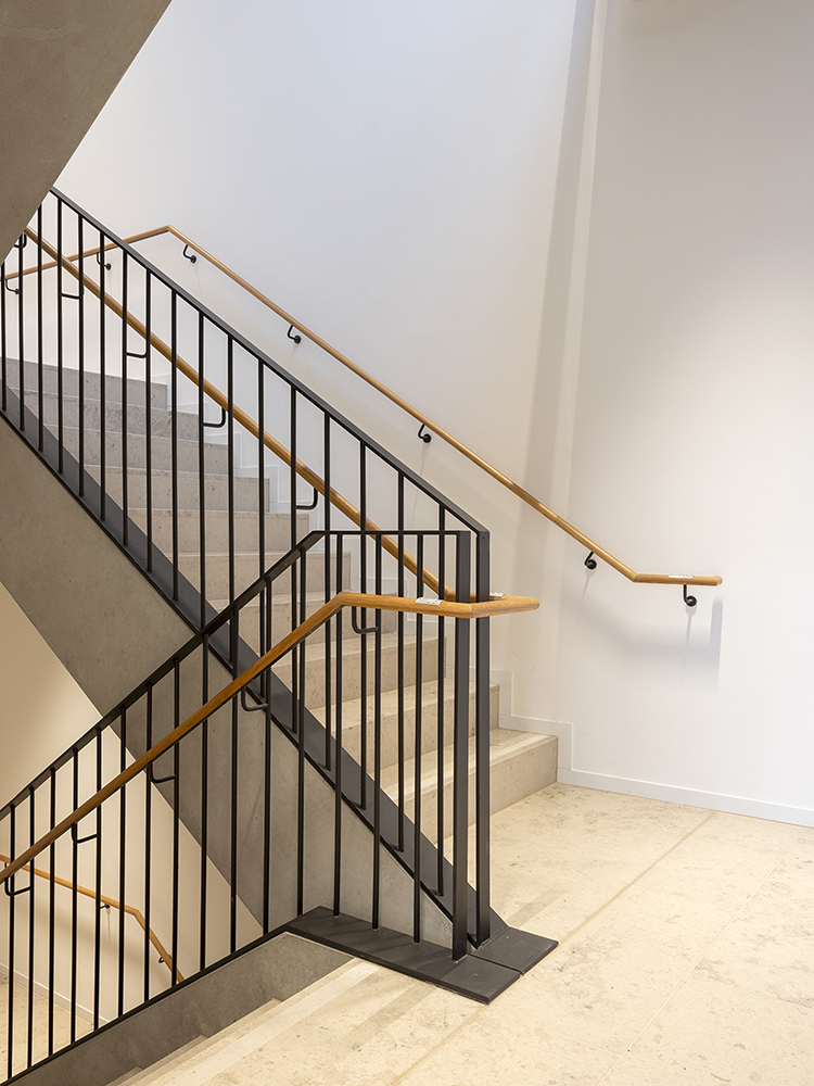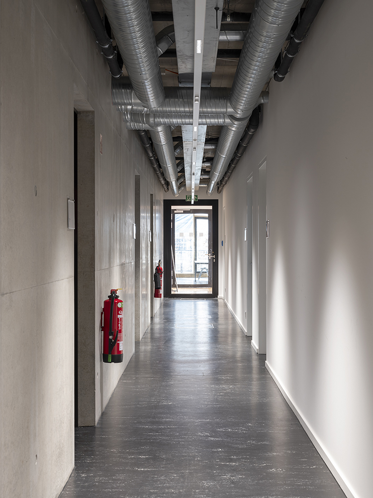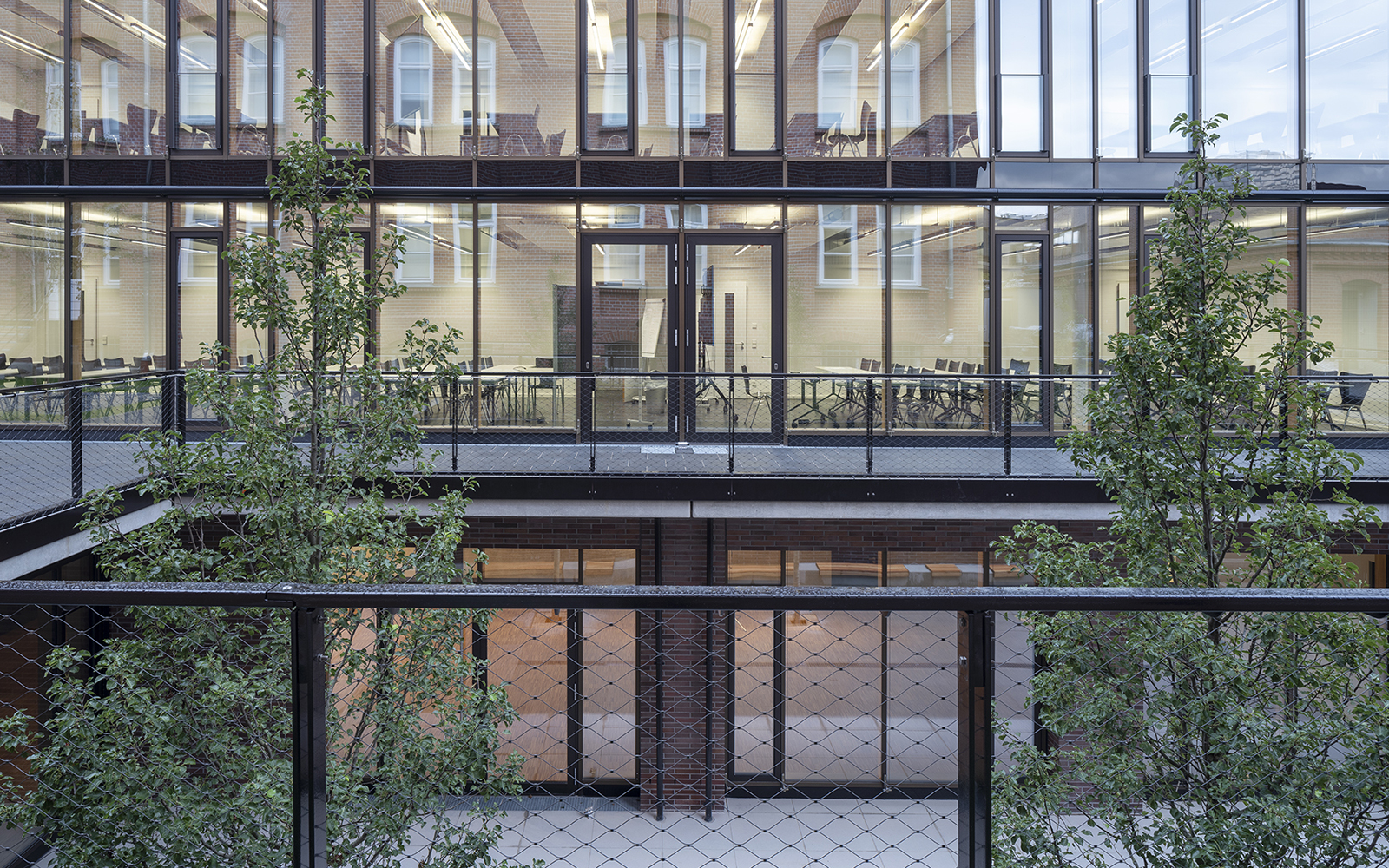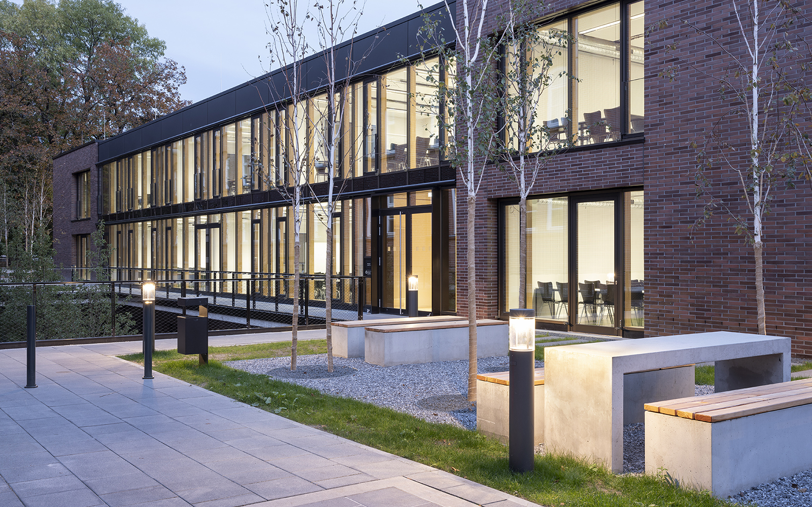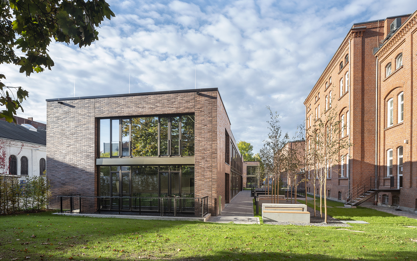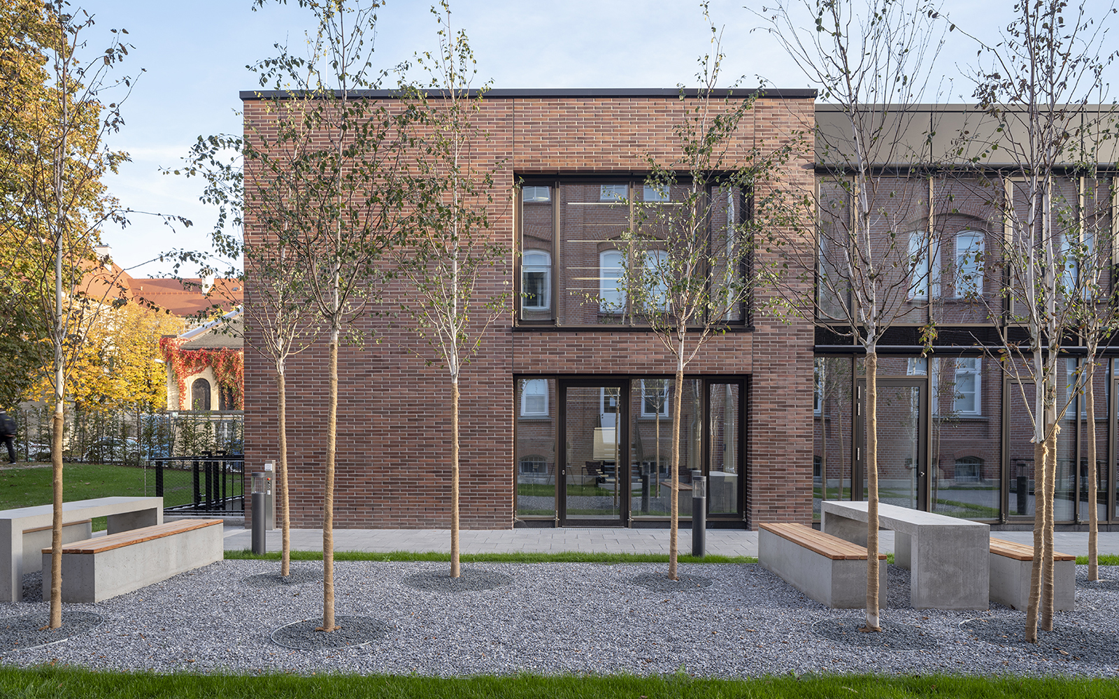 Die Gestaltung der Fassaden mit Klinkerstein und großzügigen Glasflächen der Holz-Pfosten-Riegel-Fassade, in denen sich die alten Gebäude spiegeln, wird im Innenbereich ergänzt mit einer reduzierten Auswahl an Materialien und Farben: Sichtbeton, schwarzer Stahl, heller Naturstein, dunkles Linoleum oder Industrieparkett.