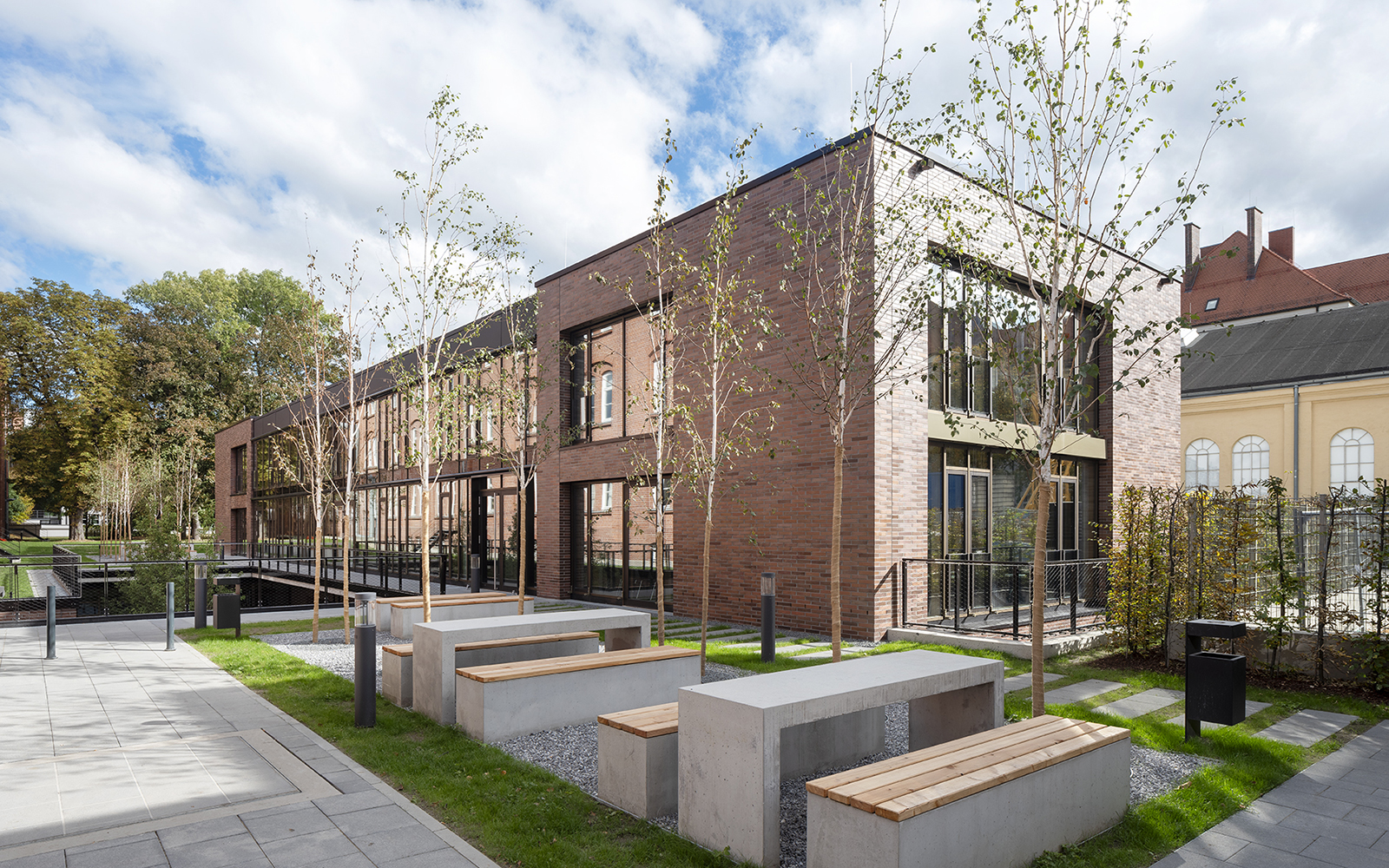 Die hochwertige Freiflächengestaltung leistet einen wichtigen Beitrag zur Einbindung der Pavillons in den Kontext des denkmalgeschützten Ensembles.