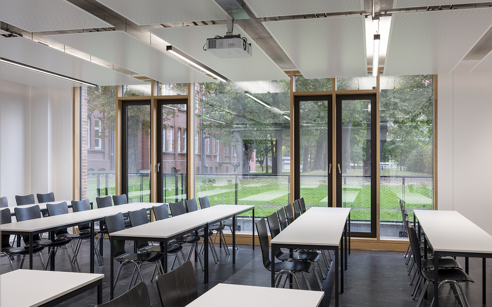 Die umfangreiche technische Ausstattung mit akustisch wirksamen Deckensegeln zum Heizen und Kühlen, ergänzt durch eine hochwertige Beleuchtung und Medientechnik ermöglichen eine optimale Nutzung des Gebäudes.
