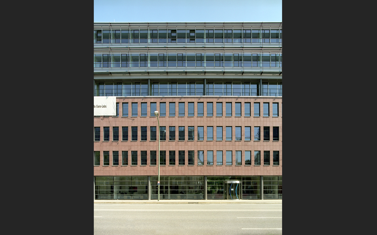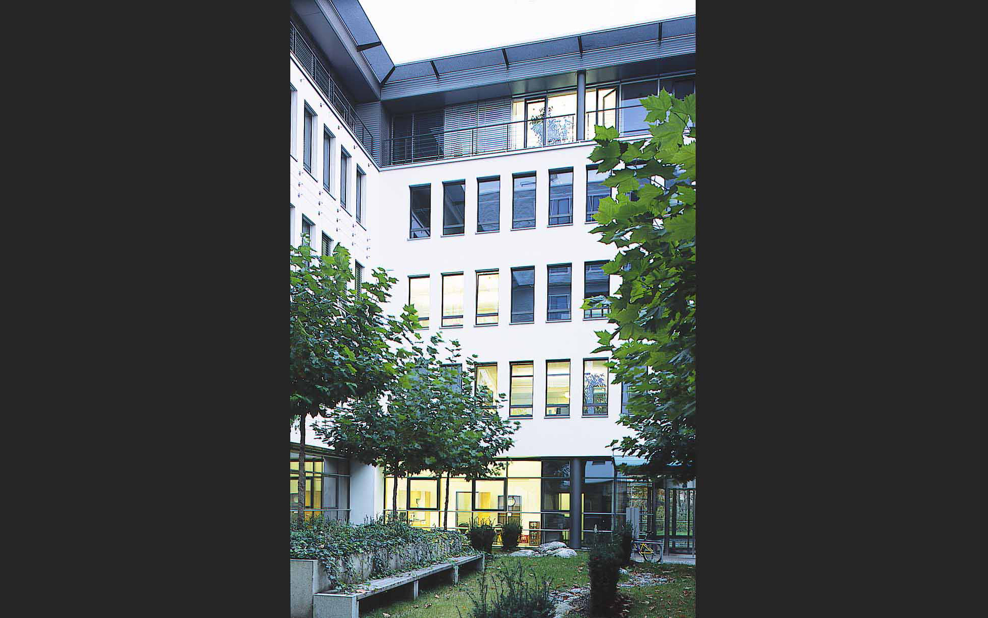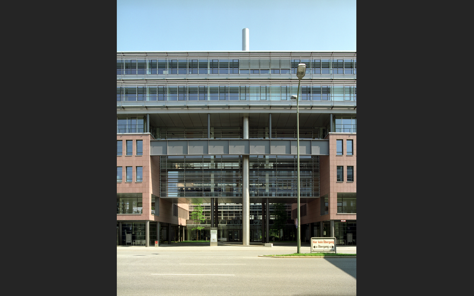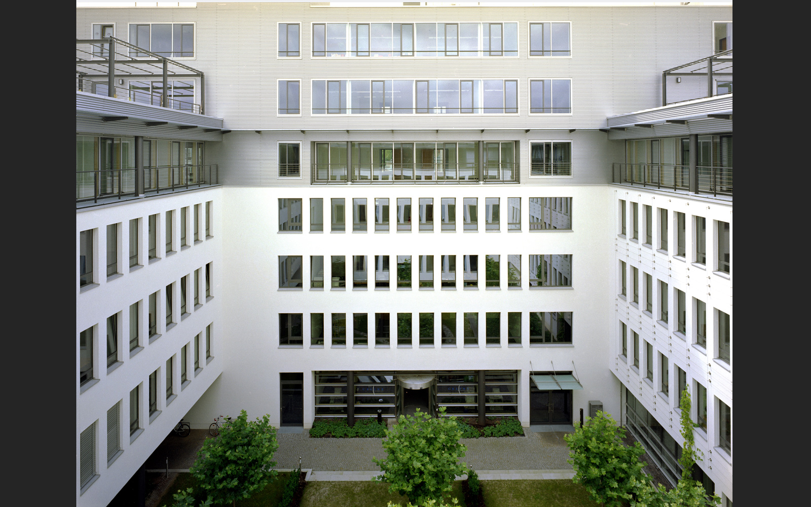 This is met by soft facades with white mineral plaster, big, open glass areas, a steel girder construction only on the ground floor. In contrast to this the outer shell towards Landsberger Straße and towards the tracks is hard and robust, clad in resistant red granite.