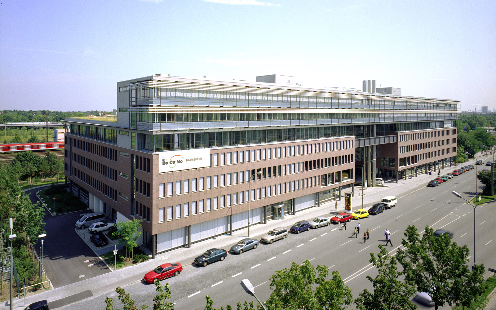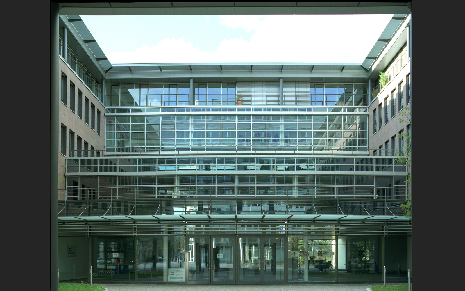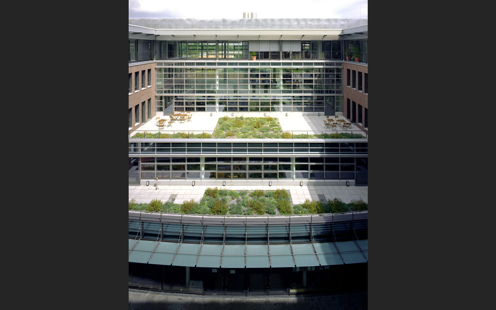 A central, transparent courtyard, into which the terrace shaped floors are falling like glass cascades, forms the centre of an estate that we could carry out at one of the most inhospitable places in the Western part of Munich.